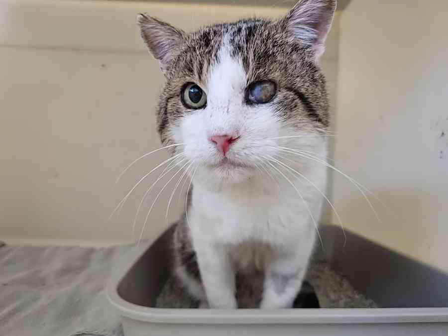 Bei eisigen Minusgraden wurde Mr. Mistoffelees hungernd und völlig entkräftet auf der Straße gefunden. Der alte Kater hatte Eiter, der aus seiner Nase rann, sein Körper war übersät mit Spuren unzähliger Kämpfe ums Überleben. Sein linkes Auge ist schwer beschädigt, er war dehydriert, ausgezehrt und bis auf die Knochen abgemagert.
