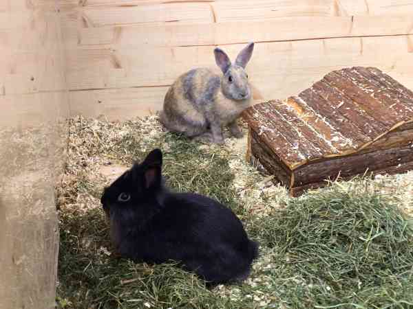 Wir sind zwei aufgeweckte und neugierige Jungkaninchen. Menschen finden wir noch etwas gruselig, wenn man sich aber Zeit nimmt und uns gute Leckereien bringt, tauen wir Schritt für Schritt auf.